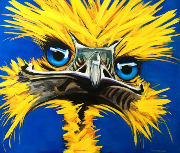 “Alter Schwede!”- ein guter Freund aus Berlin sagt das immer, wenn ihn etwas beeindruckt. Ich kannte diesen Spruch überhaupt nicht aus Österreich, und obwohl ich den Ausruf richtig witzig finde und sehr gut anwendbar, verwende ich ihn nie – und zwar aus Furcht, dass es bei mir einfach nicht so echt klingen würde! Es ist schon schräg, wie vielschichtig, komplex und sensibel Sprache doch ist, wie stark und treffend oder voll daneben sie sein kann. Da malte ich eines Tages diesen prächtig gelben Kerl von einem Emu auf tiefem, satten Blau und mir fiel ein, der „ALTE SCHWEDE aus Berlin“ – und das war dann auch exakt der Zeitpunkt seiner Taufe! Das war eine meiner lustigsten Namensfindungen- ein passenderes Wort-Farbspiel kann ich mir kaum vorstellen!