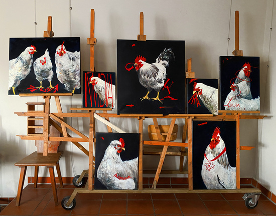 Mit ein wenig Feinjustierung seiner Gestik, besonders der Augengegend, wird das Huhn zu Statement, Vermittler und Ausdrucksform generationsübergreifender menschlicher Zivilisationsbestrebungen.