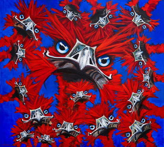 Ich habe die Kinder von Maria Theresia oben links beginnend im Kreis, gegen den Uhrzeigersinn, in chronologischer Geburtenabfolge angeordnet. Innerhalb der Schnäbel habe ich unauffällig ihre jeweiligen Namen vermerkt. So bietet sich dem Betrachter die Möglichkeit, auch deren konkrete Identitäten zu erfahren und dieses ungewöhnliche Mutter-Kind Portrait auf mehreren Sinnesebenen zu erleben.