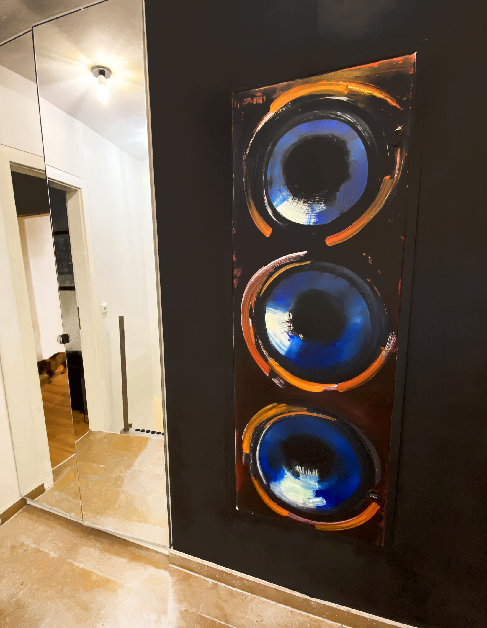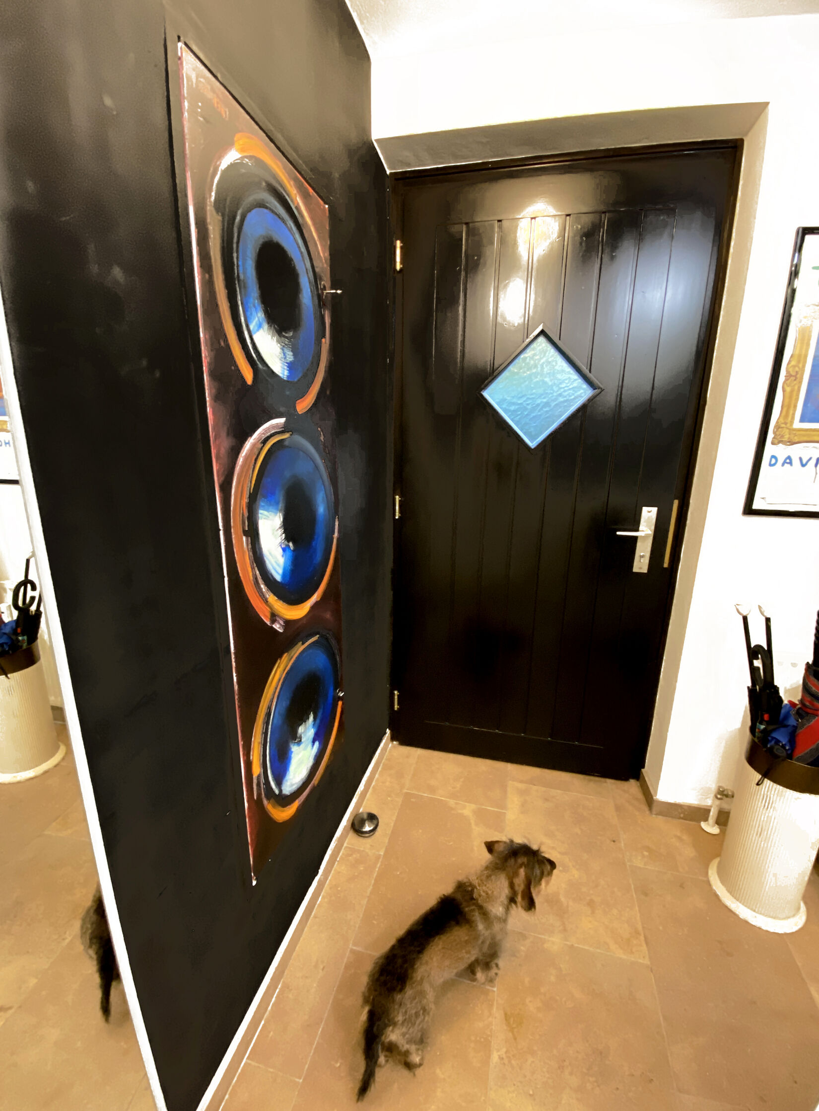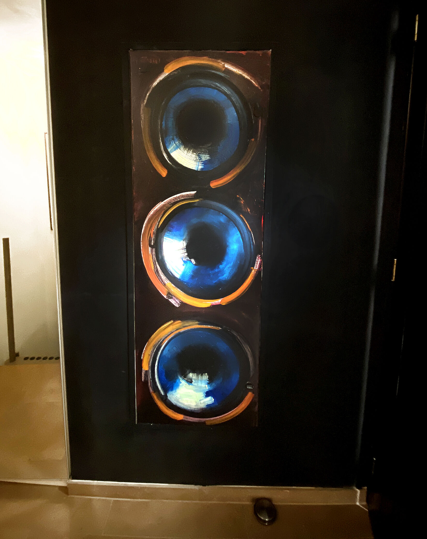 Die Türe kam zu mir ins Atelier in ihrer Fabriksfarbe Hellgrau. Mein Auftrag lautete, die unansehnliche und etwa 150cm hohe Türe in den ihr zugedachten kleinen Vorraum so einzugliedern, dass sie optisch nicht stören würde. Ich entschloss mich dazu einen Schritt weiter zu gehen und verwandelte (laut Hausbesitzer) den Zugang zum Sicherungskasten in ein „rückreflektierendes zentrales, künstlerisches Hauseingangs-Highlight!“ Es war mir eine echte Gaudi, diese Türe zu bemalen!